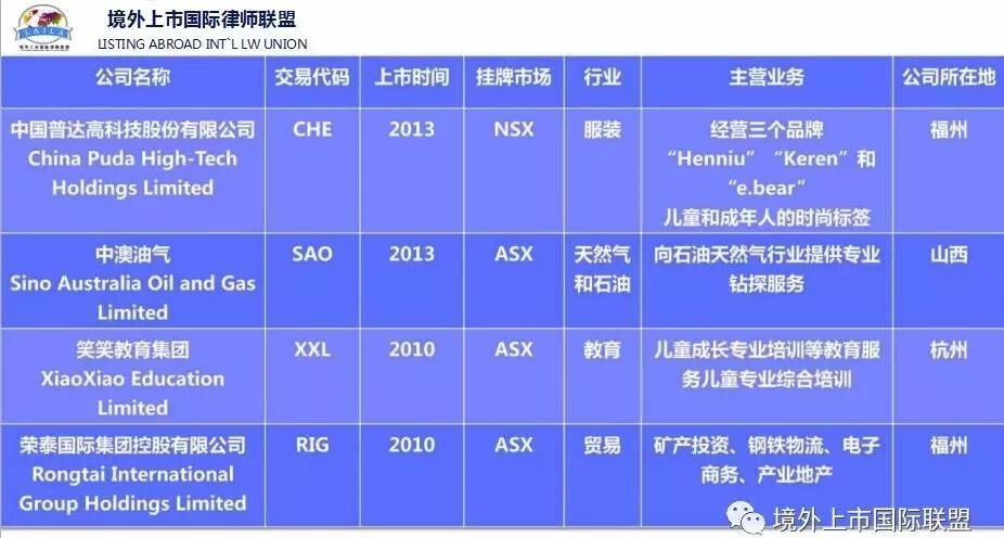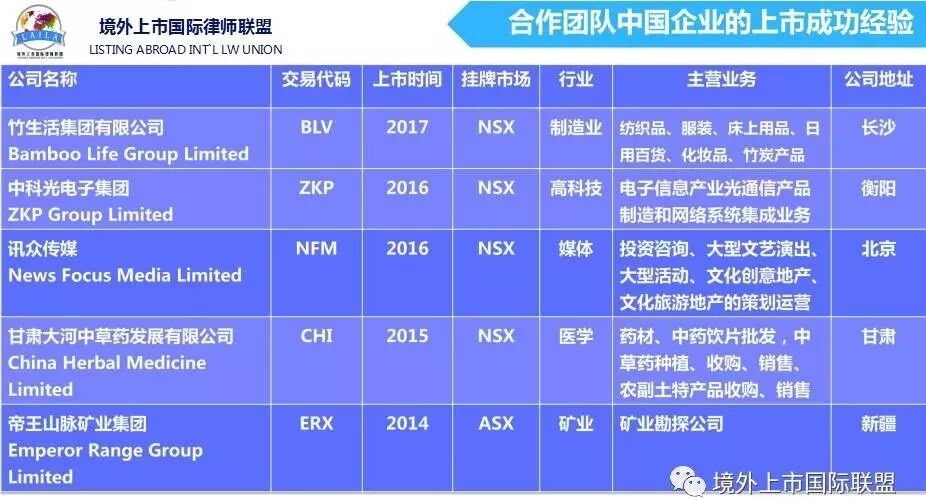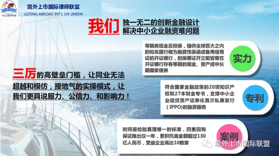 我们境外上市国际律师联盟和华斯达克金融控股集团(中国)股份有限公司合作,于2016年开始主要从事企业境外上市和信贷资产证券化业务。主要推出国内首创独一无二的企业境外上市(澳洲)新模式:为企业代垫前期国内外辅导费用(市场价1200-1500万)帮助企业上市,企业境外(澳洲)上市的条件是:一是合规上市,要求企业有两年以上业绩,前一年有盈利,上市前年税后利润1000万以上(合规上市时间6-9个月),一般市盈率5-8倍;二是IPO上市,要求企业有三年以上业绩,前两年业绩持续增长,上市前年税后利润2000万以上(IPO上市时间9-12个月),一般市盈率在17-25倍。如果企业目前不符合境外上市条件,但符合孵化条件的(即企业通过我们帮助融资后,在未来的三五年能达到年税后利润2000万以上的)我们帮助企业用五种证券化融资方式:商品、艺术品、不动产、知识产权、股权等融资并辅导达到上市条件,上市后企业以股票作为回报,为帮助中小企业解决融资难融资贵上市难的问题。